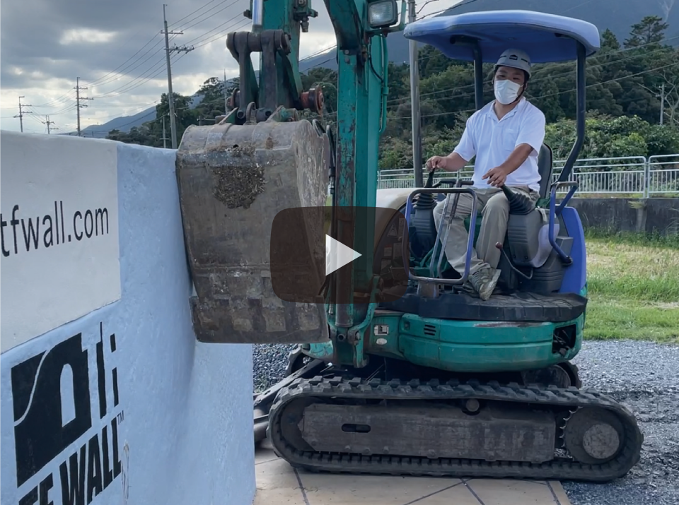 TF WALLはショベルカーがフルスイングしても倒れないほど、強度に自信があります。